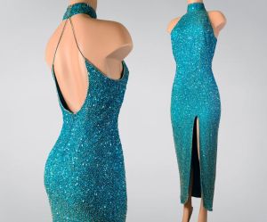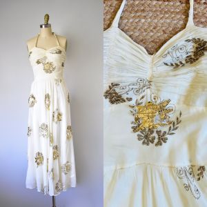 - No Label Present1970s Navy Blue and Cream Polka Dot Halter Open Back Full Length Formal Prom Dress - XXS$198.00Add to Favorites