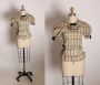 1930s 1940s Tan, Pink & Green Plaid Short Sleeve Gathered Bustle Bow Tie Victorian Style Cottagecore
