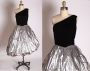 1950s Black Velvet and Silver Lame Fit and Flare Bubble Skirt One Shoulder Dress - S