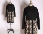 1960s Black Polyester Tan Quilt Fringe Long Sleeve Knee Length Dress - M/L