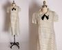 1960s Off White and Sheer Insert Striped Velvet Bow Collar Short Sleeve Shift Dress - S