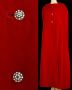 Medium weight soft red velvet is worked into a classic cape which fastens down the center front with three large domed buttons with inset rhinestones as pictured.