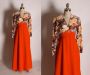 1970s Orange and Brown Lurex Floor Length Long Sleeve Floral V-Neck Formal Dress - XS/S
