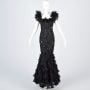 Form fitting with the the perfect hourglass shape and mermaid hem. Curvy, powerful, and sexy. Dramatic layered ruffles frame the face along the neckline and bring it home with that incredible hem. Black silk, with a black lace overlay, black sequin embellishments and all the lovely details you'd expect from a high quality designer garment. Are you ready to make an entrance?