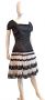 Black satin ruffled bodice and sleeves. Sheer white skirt with black lace. Capped sleeves. Dropped waist. Square neckline.