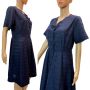 50s Dark Blue Day Dress w Bow Sheer Stripes Scalloped Neckline | S/M