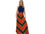 Top portion is ribbed. Skirt portion has wide and thin chevron stripes and A-line shape. Back zipper closure. Machine washable, no material is named but I imagine this is polyester or similar.