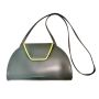 Stylish vintage Jacques Vert bag, likely late 1980s into early 1990s, made in Italy. Crafted from soft dove gray leather with a bold neon yellow trim — a perfect pop of color against the sculptural half-moon silhouette. Features a black fabric lining with one slip pocket, magnetic snap closure, and gold-tone hardware at the strap attachments. Strap is removable by twisting the gold attachements, allowing this piece to be worn as a crossbody/shoulder bag or carried as a clutch.