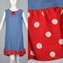 XL 1970s Blue Chambray Shift Dress Sleeveless Red Polka Dot Ruffle and Neck Tie