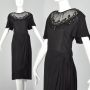 Large 1940s Black Dress Rockabilly Draped Skirt Sheer Yolk Sequin Rhinestone Midi Cocktail