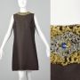 Large 1960s Brown Shift Beaded Collar Sleeveless Dress Silk Wool Blend Cocktail Party