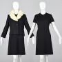 Large 1960s Shift Dress Set Black Double Breasted Boxy Jacket with White Mink Fur Collar