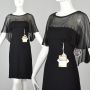 Medium 1960s Dress Black Cocktail Deadstock Sheath Sheer Chiffon Capelet Daisy Trim