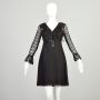 Medium 1970s Black Dress Ruffle Collar Neckline Rhinestone Button Lattice Sheer Long Sleeve
