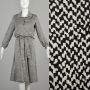 Medium 1970s Black White Dress Abstract Satin Blouson Sash Belt Business Casual Secretary Office