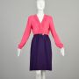 Medium 1970s Pink and Purple Colorblock Dress Sheer Belted Office Work Business Dress