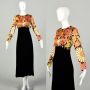Medium 1970s Psychedelic Black Velvet Maxi Dress Satin Long Sleeve Evening Gown Hostess Cocktail
