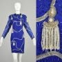 Medium 1980s Blue Silver Dress Beaded Rope Tassel Keyhole Back Sheer Long Sleeve Mini Dress