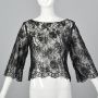 Small 1960s Top Black Floral Sheer Lace Blouse 3/4 Long Bell Sleeve Boat Neck Shirt