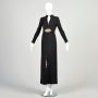 Small 1970s Black Button Up Dress Wool Knit Deep V Neck Plunge Long Sleeve Front Slit Belted Maxi
