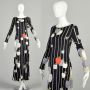 Small 1970s Black Dress White Stripes Red Grey Apples Gene Berk Mod Signature Print Long Sleeve Maxi
