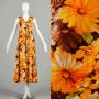 Small 1970s Floral Dress Barkcloth Orange Brown Daisies Hawaiian Tiki Casual Sleeveless Day Dress