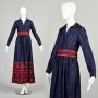 Small 1970s Navy Blue Dress Red Floral Lattice Diamonds Embroidered Collared Long Sleeve Maxi