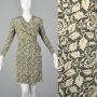 Small 1980s Louis Féraud Silk Green Dress Leaf Print Faux Wrap Long Sleeves