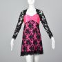 Small 1980s Travilla Hot Pink Satin Mini Dress Sheer Black Lace Overlay