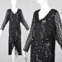 Small 1990s Oleg Cassini Dress Black Silk Beaded Long Sheer Sleeves Drop Waist Formal Art Deco