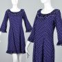 Small Navy Mini Dress 1970s White Polka Dot Ruffle Collar Hem and Cuffs 3/5 Sleeves