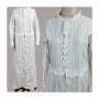 Fabric is a white cotton. Floor length, high narrow ruffled collar, front tucks, long sleeves with button front.