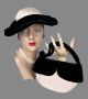 Hat has a pink twill crown surrounded by a wavy black velvet wired brim. Underneath the brim has the pink fabric lining. Crown is finished with a white satin acetate and a black grosgrain ribbon. An elastic placement band is attached for placement security.