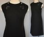 Sheath style dress features three princess seamed front panels with two cutout black lace inset panels embellished with domed black buttons with set in rhinestones as pictured.