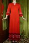 Smooth red acrylic knit with accent stripes and zigzags in silver and gold, accented with contrasting black and purple. Sculpted V neckline & slightly dropped shoulder. Gorgeous ¾ length bell sleeves are perfect for flaunting a sparkly bracelet! This dress is a perfect choice for upcoming holiday parties.