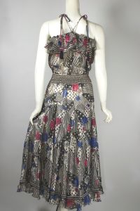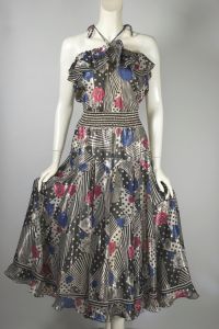 - No Label Present1970s Navy Blue and Cream Polka Dot Halter Open Back Full Length Formal Prom Dress - XXS$198.00Add to Favorites