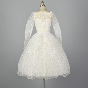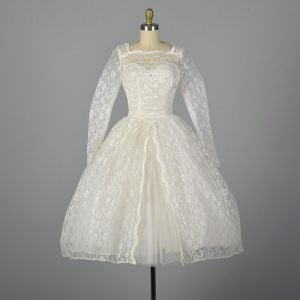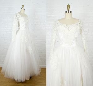 - No Label Present1950s wedding gown dress tulle lace long sleeved lace illusion ivory Size S XS$259.00Add to Favorites