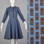 XS 1950s Quilted Blue Dress Fitted Waist Full Skirt Orange Floral Print Rockabilly