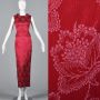 XS 1960s Dress Two Piece Set Red Pink Floral Long Maxi Hobble Skirt Sleeveless Matching Top