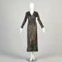 XS 1970s Black Bronze Sequin Dress Silver Lurex Long Sleeve Formal Evening Maxi