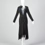 XS 1980s Casadei Black Ruched Knit Dress Handkerchief Hem Long Sleeve Beaded Mesh