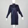 XS 1980s Galanos Navy Dress Power Shoulders Long Sleeve Blue Crepe Satin Pleated Trim