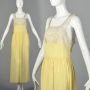 XS 1940s Pastel Yellow Nightgown Sheer Lace Top Blue Ribbon Trim Elastic Waist Long Maxi Lingerie