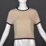 XS Tan Sweater Top 1990s Cropped Short Sleeve Wool Black Trim Beige Shirt