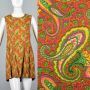 Small Orange Micro Mini Dress 1960s Green Purple and Yellow Paisley Print Loose Drop Waist